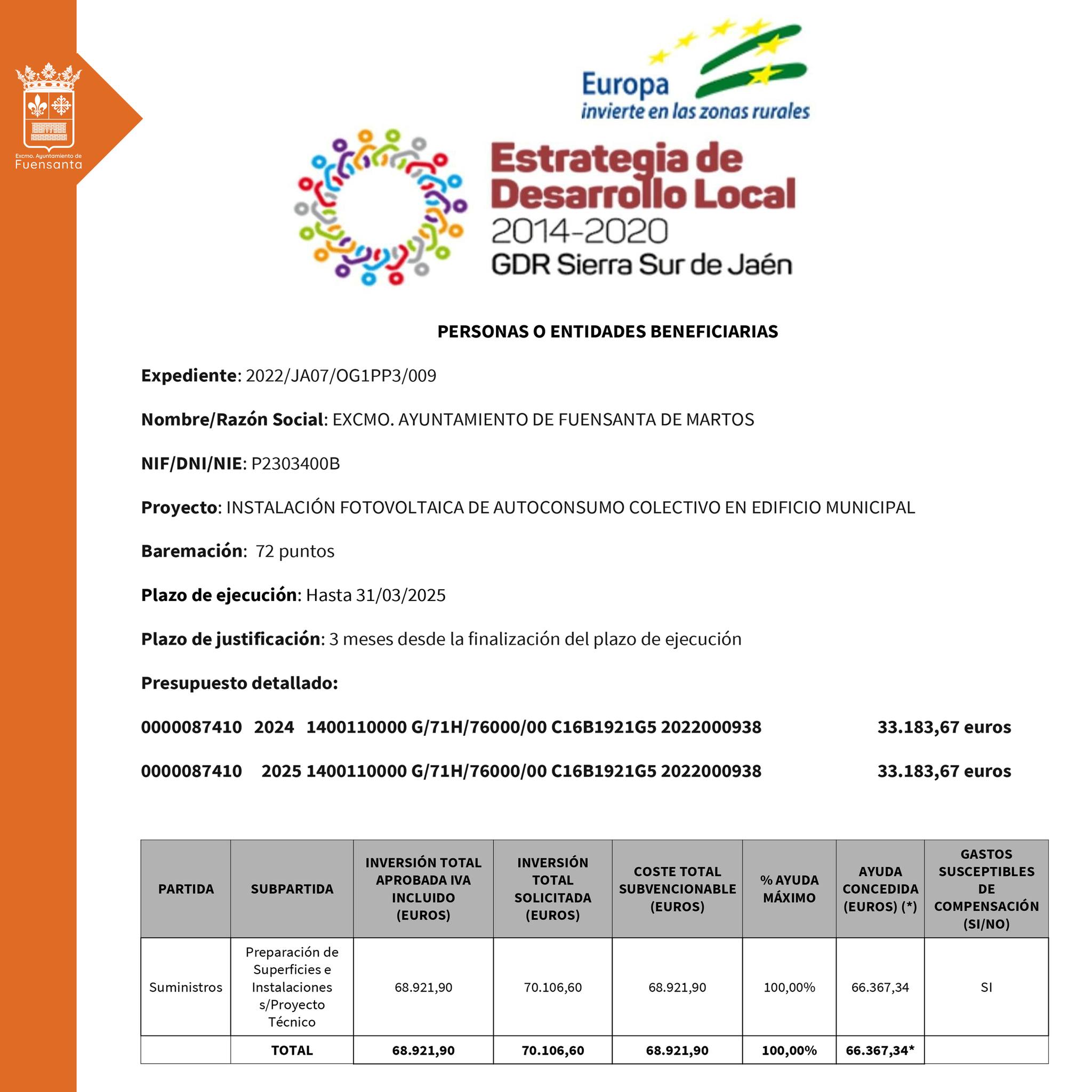 Nos alegra poder informaros de que nuestro municipio ha recibido una subvención gestionada por ADSUR (Grupo de Desarrollo Rural de la Sierra Sur de Jaén) de 68.921,90€ destinados a la instalación fotovoltaica de autoconsumo colectivo que está previsto […]