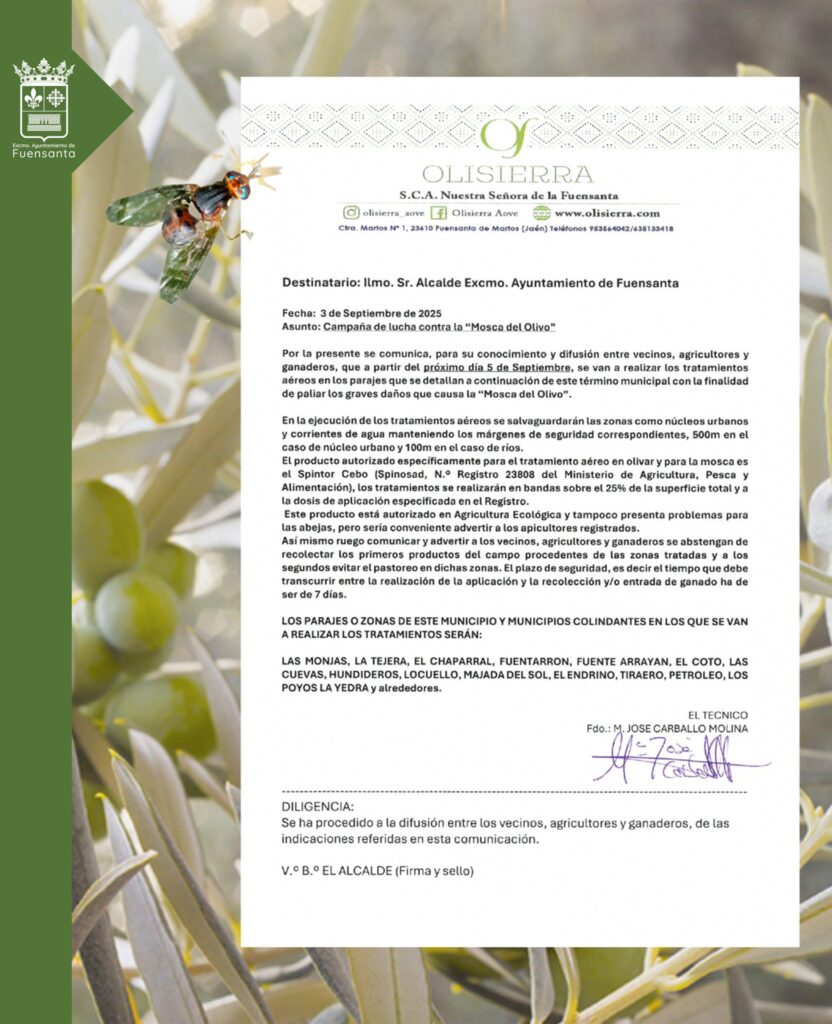 Desde la S.C.A. Nuestra Señora de la Fuensanta nos hacen llegar un documento informativo sobre el tratamiento que se va a realizar próximamente en distintos parajes de nuestra localidad, contra la denominada «Mosca del Olivo».⁣