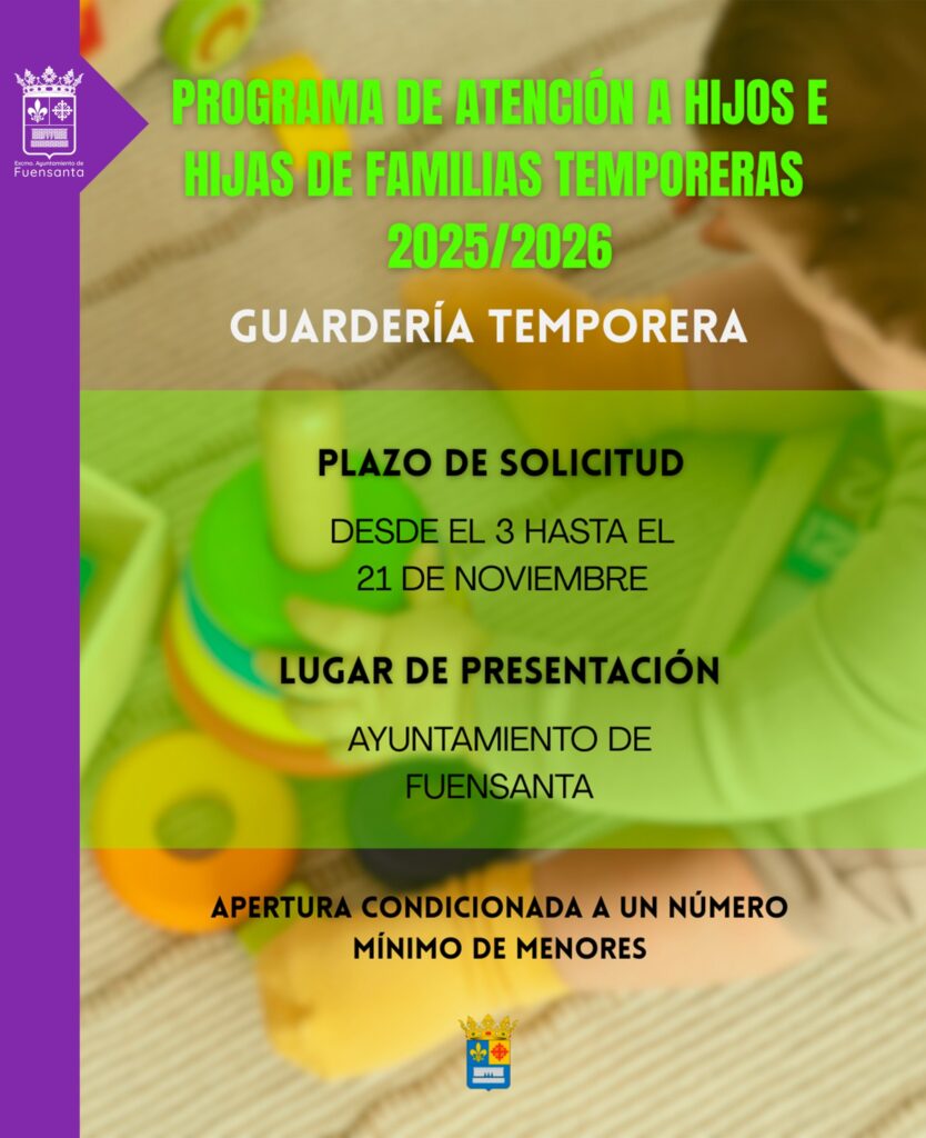 A partir de hoy día 3 de noviembre se abre el plazo de solicitudes para el 𝗽𝗿𝗼𝗴𝗿𝗮𝗺𝗮 𝗱𝗲 𝗮𝘁𝗲𝗻𝗰𝗶𝗼́𝗻 𝗮 𝗵𝗶𝗷𝗼𝘀 𝗲 𝗵𝗶𝗷𝗮𝘀 𝗱𝗲 𝗳𝗮𝗺𝗶𝗹𝗶𝗮𝘀 𝘁𝗲𝗺𝗽𝗼𝗿𝗲𝗿𝗮𝘀 𝟮𝟬𝟮𝟱/𝟮𝟬𝟮𝟲, la guardería temporera. Dicho plazo se extiende hasta el día 21 de noviembre de 2025.