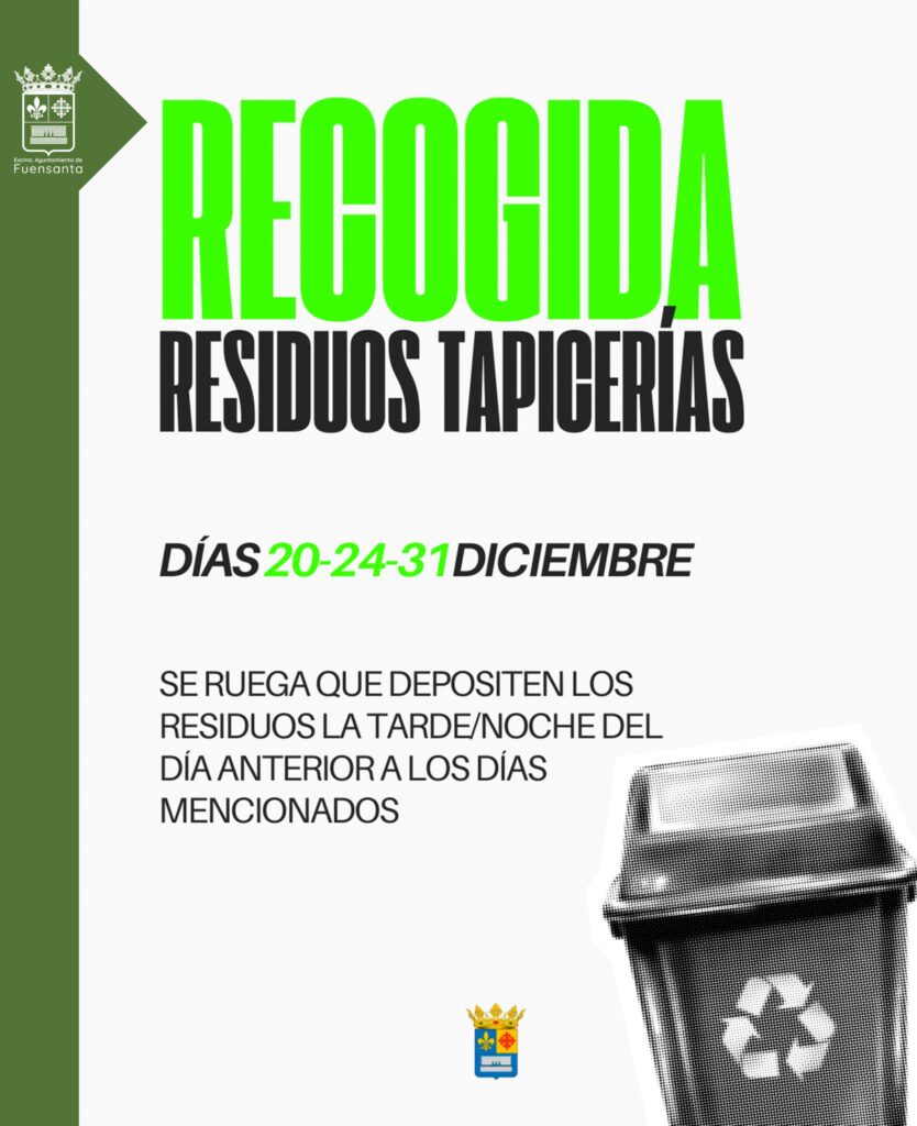 Los residuos de tapicería se recogerán los días 20, 24 y 31 de diciembre de madrugada.