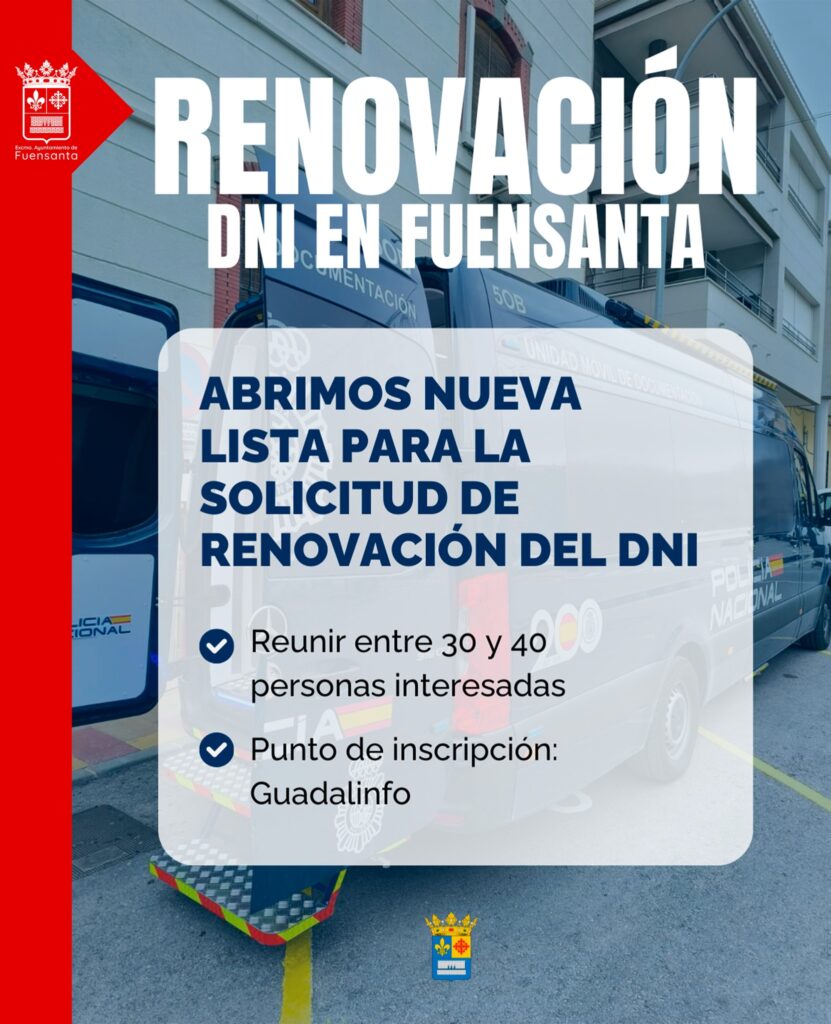 Desde el Ayuntamiento estamos organizando una nueva visita del equipo móvil de la Policía Nacional para facilitar la renovación del DNI sin salir de Fuensanta.