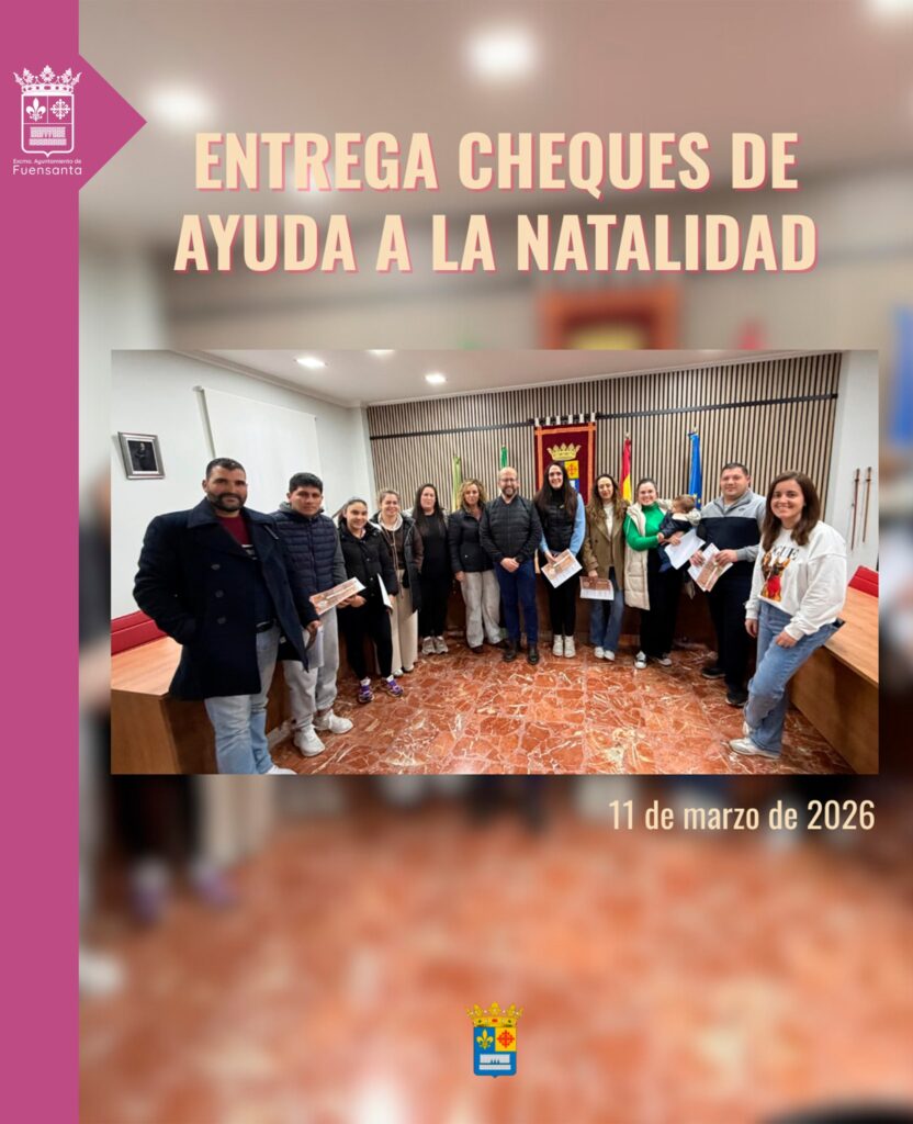El pasado miércoles, tanto el Alcalde de Fuensanta, Antonio Navas, como la Concejala de Cultura y Educación, Eva Molina, hicieron entrega de los cheques de ayuda a la natalidad de 150€, a 16 familias con bebés nacidos durante el año pasado. Esta iniciativa busca apoyar a estas familias en los gastos asociados a la llegada de un nuevo miembro, además de incentivar la natalidad y contribuir a frenar la despoblación en nuestros municipios rurales.⁣