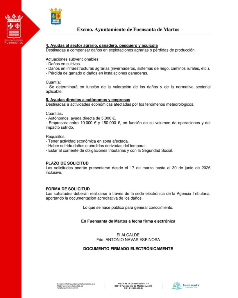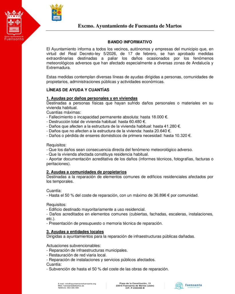 El Ayuntamiento de Fuensanta de Martos informa sobre varias ayudas extraordinarias aprobadas por el Gobierno para paliar los daños causados por recientes fenómenos meteorológicos en Andalucía y Extremadura.