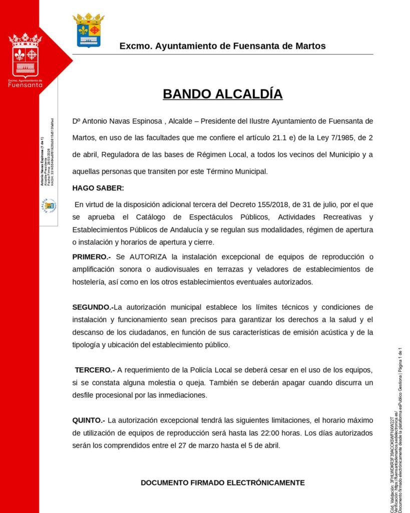 Durante las fiestas de Semana Santa, del 27 de marzo al 5 de abril, los establecimientos de hostelería y terrazas de Fuensanta podrán disponer de equipos de música y reproducción audiovisual hasta las 22:00 horas.