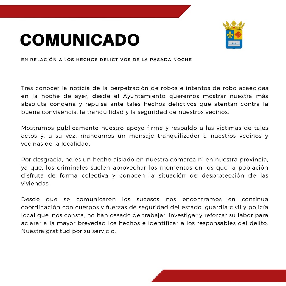 Tras conocer la noticia de la perpetración de robos e intentos de robo acaecidas en la noche de ayer, desde el Ayuntamiento queremos mostrar nuestra más absoluta condena y repulsa ante tales hechos delictivos que atentan contra la […]