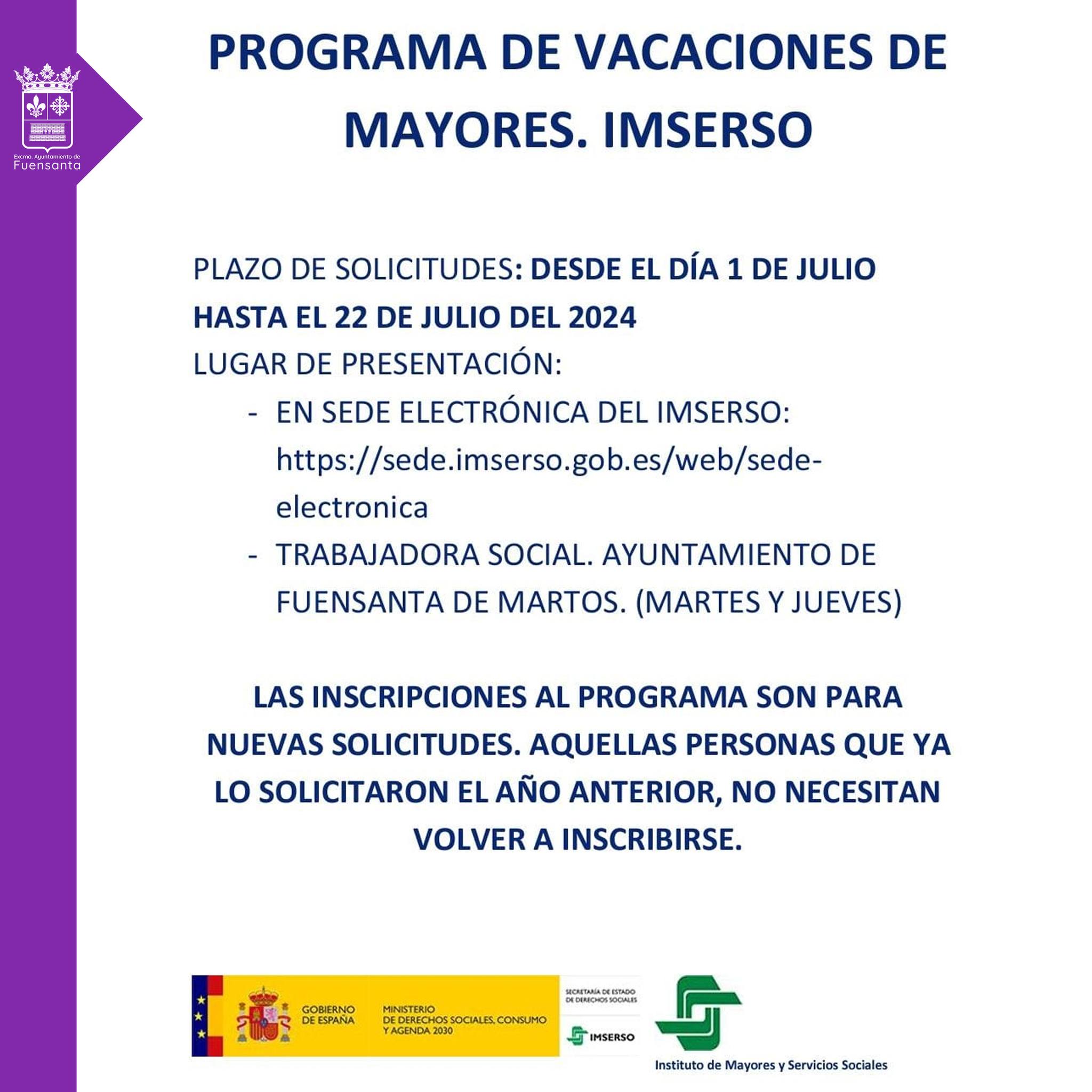 El plazo para inscribir solicitudes en el programa de vacaciones de mayores (Imserso) será desde el próximo lunes día 1 de julio hasta el 22 de julio de 2024. Se podrá presentar: