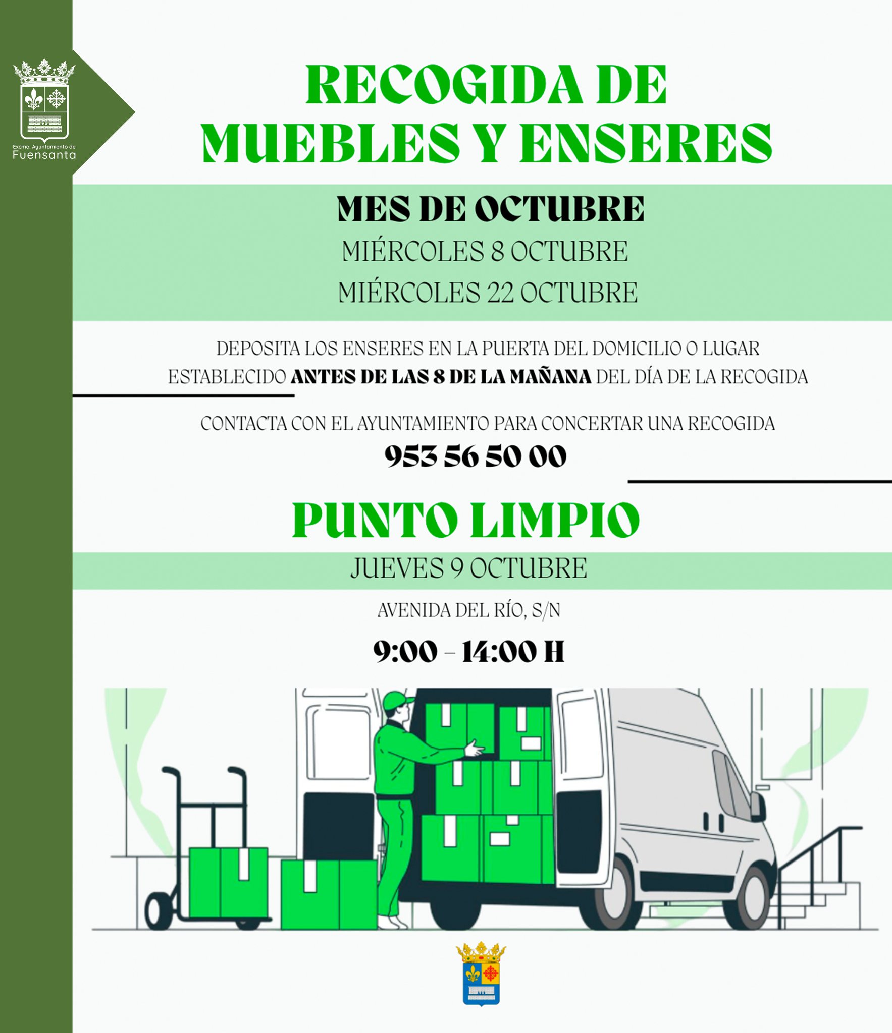 𝗙𝗘𝗖𝗛𝗔𝗦Miércoles 𝟴 𝗱𝗲 𝗼𝗰𝘁𝘂𝗯𝗿𝗲Miércoles 𝟮𝟮 𝗱𝗲 𝗼𝗰𝘁𝘂𝗯𝗿𝗲Deja tus enseres en la puerta de tu domicilio la noche de antes o antes de las 8:00 h del día correspondiente.𝗣𝗮𝗿𝗮 𝗰𝗼𝗼𝗿𝗱𝗶𝗻𝗮𝗿 𝗹𝗮 𝗿𝗲𝗰𝗼𝗴𝗶𝗱𝗮, 𝗹𝗹𝗮𝗺𝗮 𝗮𝗹 𝗔𝘆𝘂𝗻𝘁𝗮𝗺𝗶𝗲𝗻𝘁𝗼: 𝟵𝟱𝟯 𝟱𝟲 𝟱𝟬 𝟬𝟬𝗣𝗨𝗡𝗧𝗢 […]