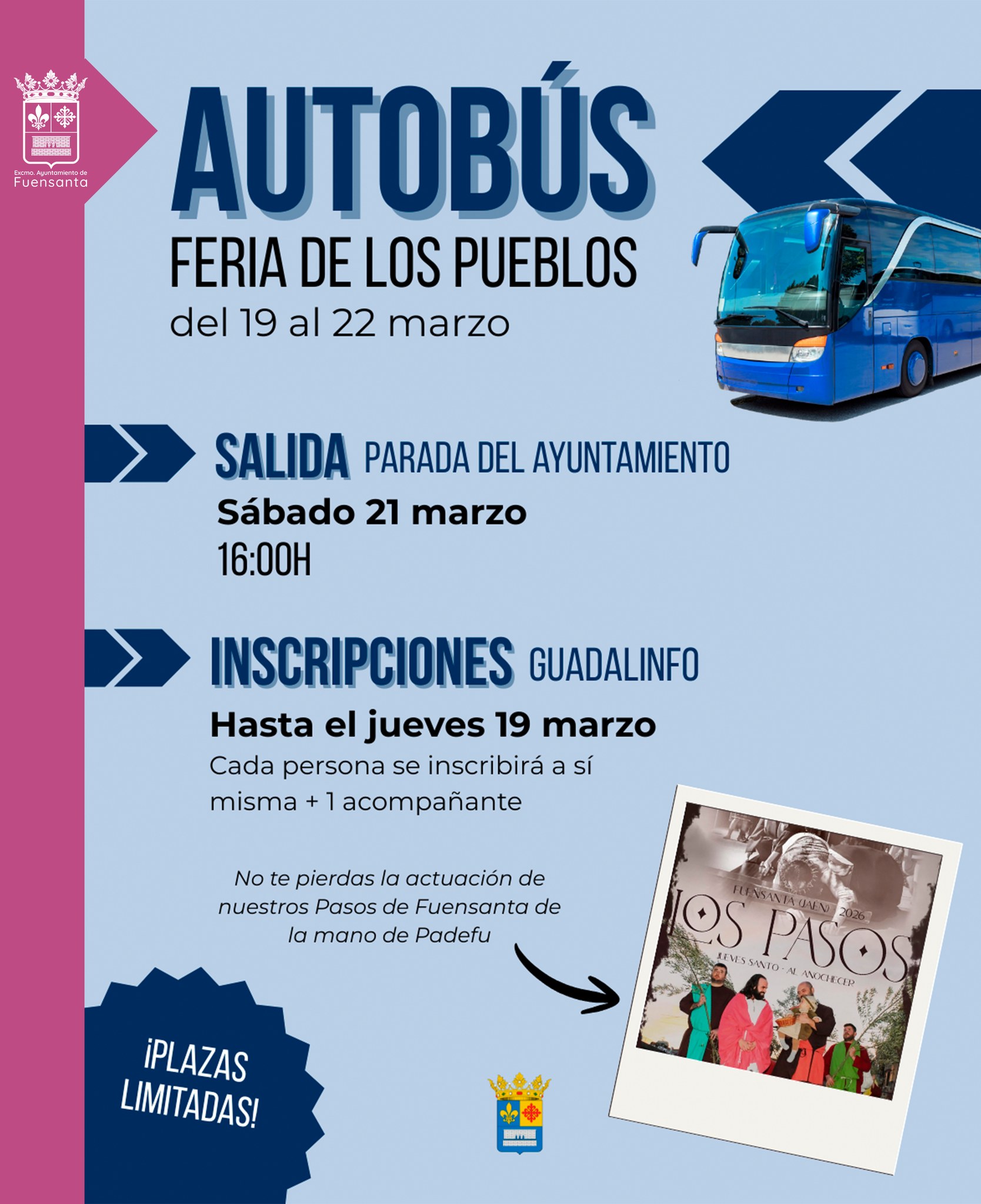 El Ayuntamiento pone a disposición de todo el pueblos un autobús gratuito el próximo sábado 21 de marzo para visitar a la Feria de los Pueblos, que se celebra del 19 al 22 de marzo en IFEJA (Jaén).